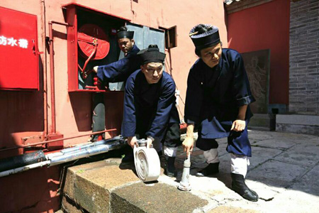 演练还假设大殿西侧起火,道观人员通过使用院内消火栓,对起火点进行扑救。另外,庙内中控室操作人员对中控室消防设备进行了一次全面的操作演练。